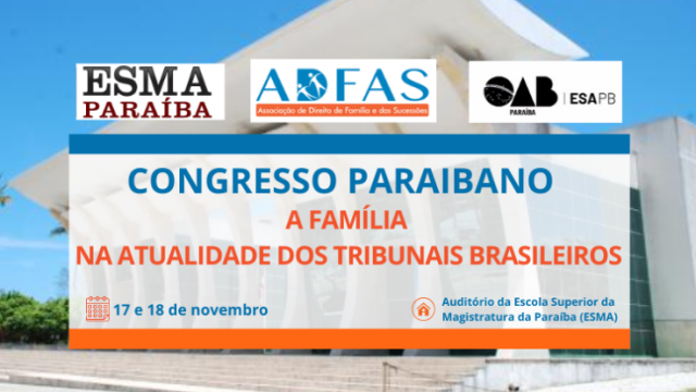 Nos dias 17 e 18 de novembro, a Associação de Direito de Família e das Sucessões (ADFAS), a Escola Superior da Magistratura da Paraíba (ESMA/PB) e a Escola Superior de Advocacia da Paraíba (ESA/PB) realizarão o Congresso: “A Família na Atualidade dos Tribunais Brasileiros”.