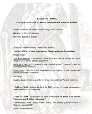 "Dia Internacional de Combate à Corrupção será lançada a nova obra do INAC - Instituto Não Aceito Corrupção, coordenada por mim, Tereza Sadek e Rita Biason com o selo editorial Almedina Brasil. São 43 autores - Corrupção no Brasil e no Mundo - Transparência, política e análises.